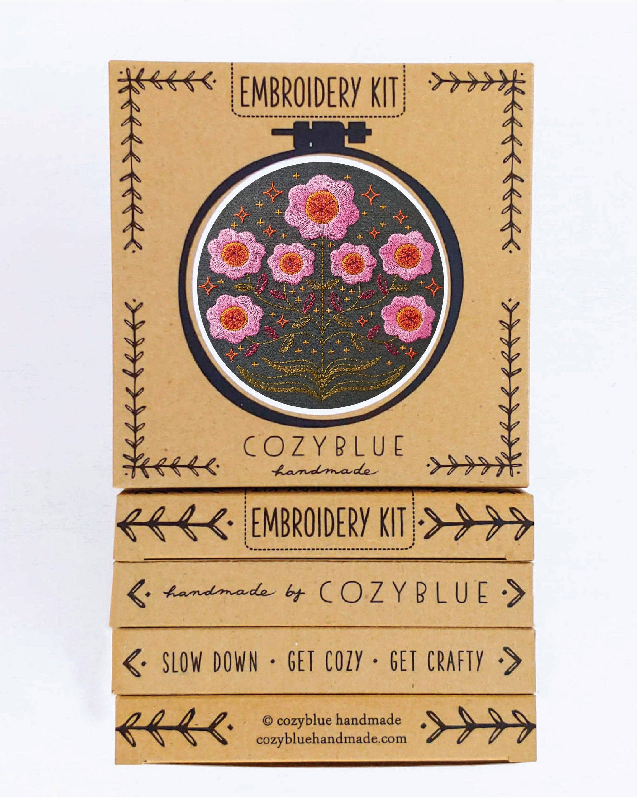 cozyblue embroidery kits include everything you need to create your own hand embroidered hoop. the pattern design is pre-printed on 100% cotton fabric, so there's no need for transferring or tracing. just pop the fabric in the hoop, thread your needle, and start stitching! these make easy and wonderful gifts. crafty friends, family, teachers, and co-workers will love them. or treat yourself, and have fun stitching something awesome. embroidery is a great way to slow down, get cozy, and get crafty.